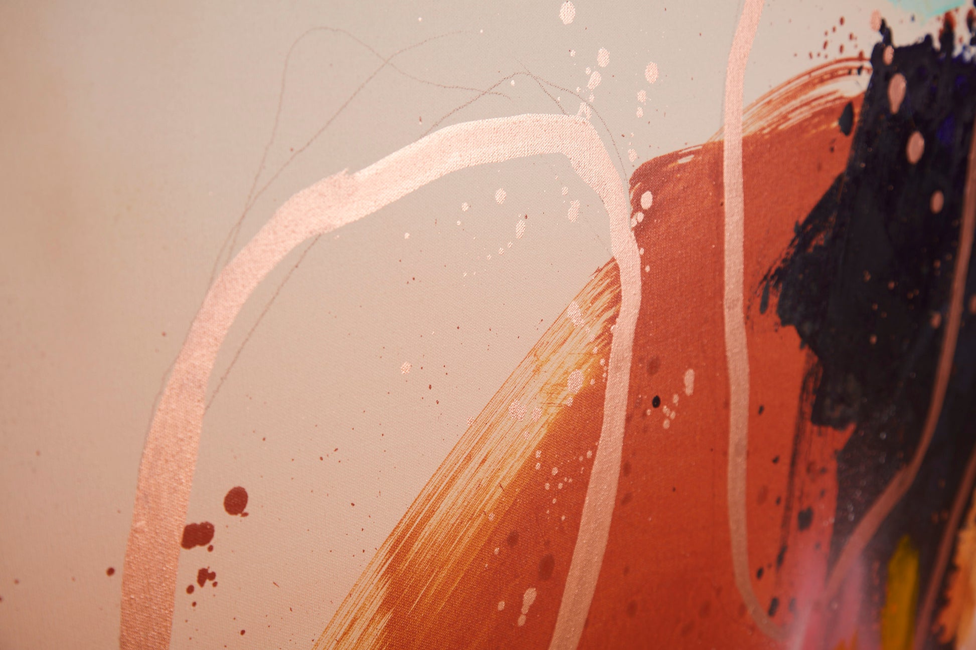 Paintings are constructed in layers - moving back and forth between the studio floor and an easel - to create all the drips, splashes, texture and detail.