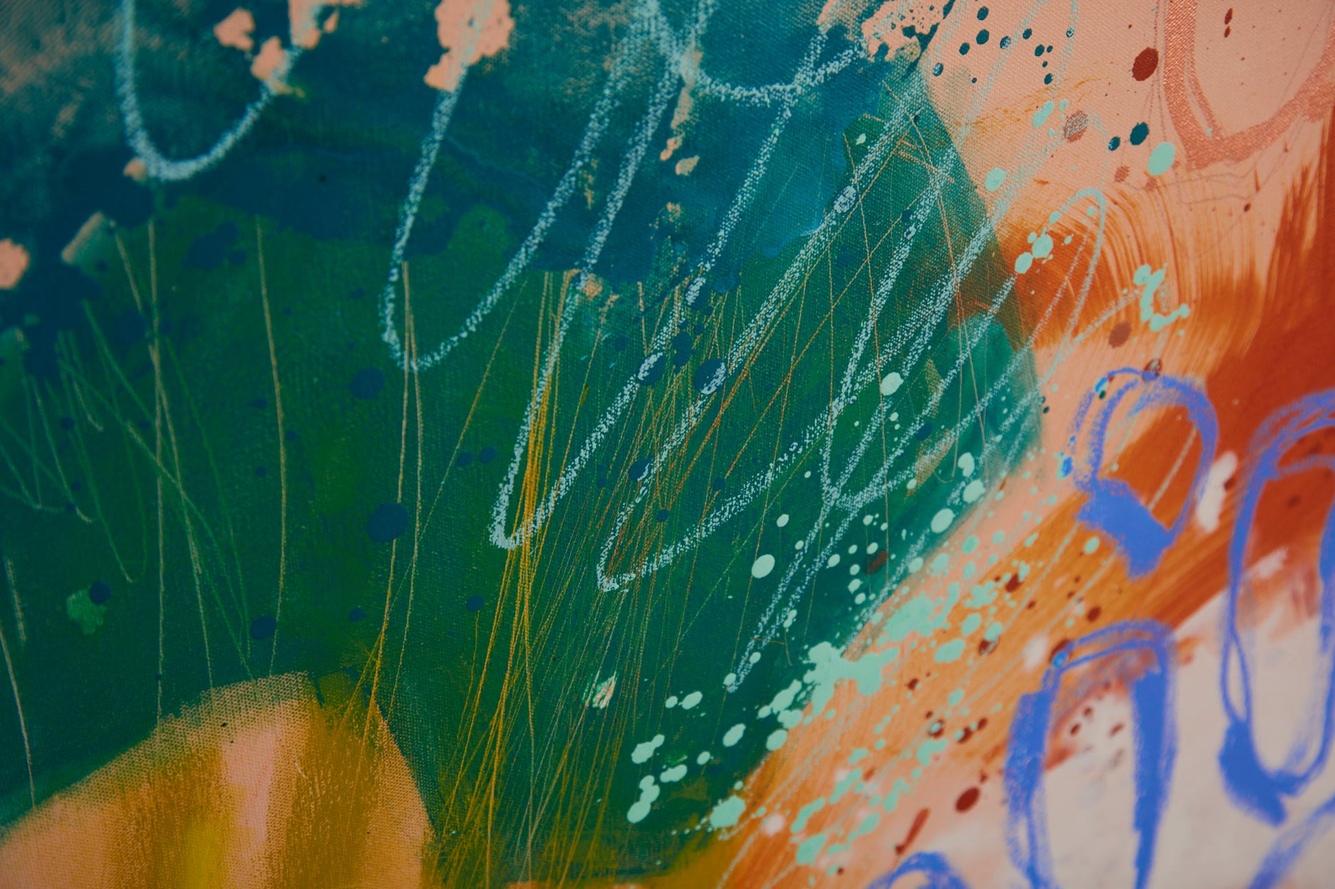 Mixed media original painting on stretched canvas. Media includes acrylic, oil paint stick, spray paint, oil pastel, colored pencil, graphite.