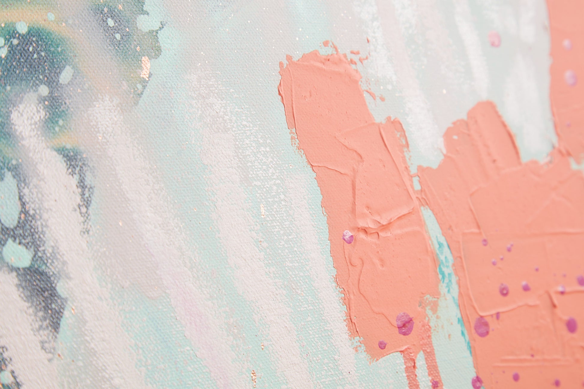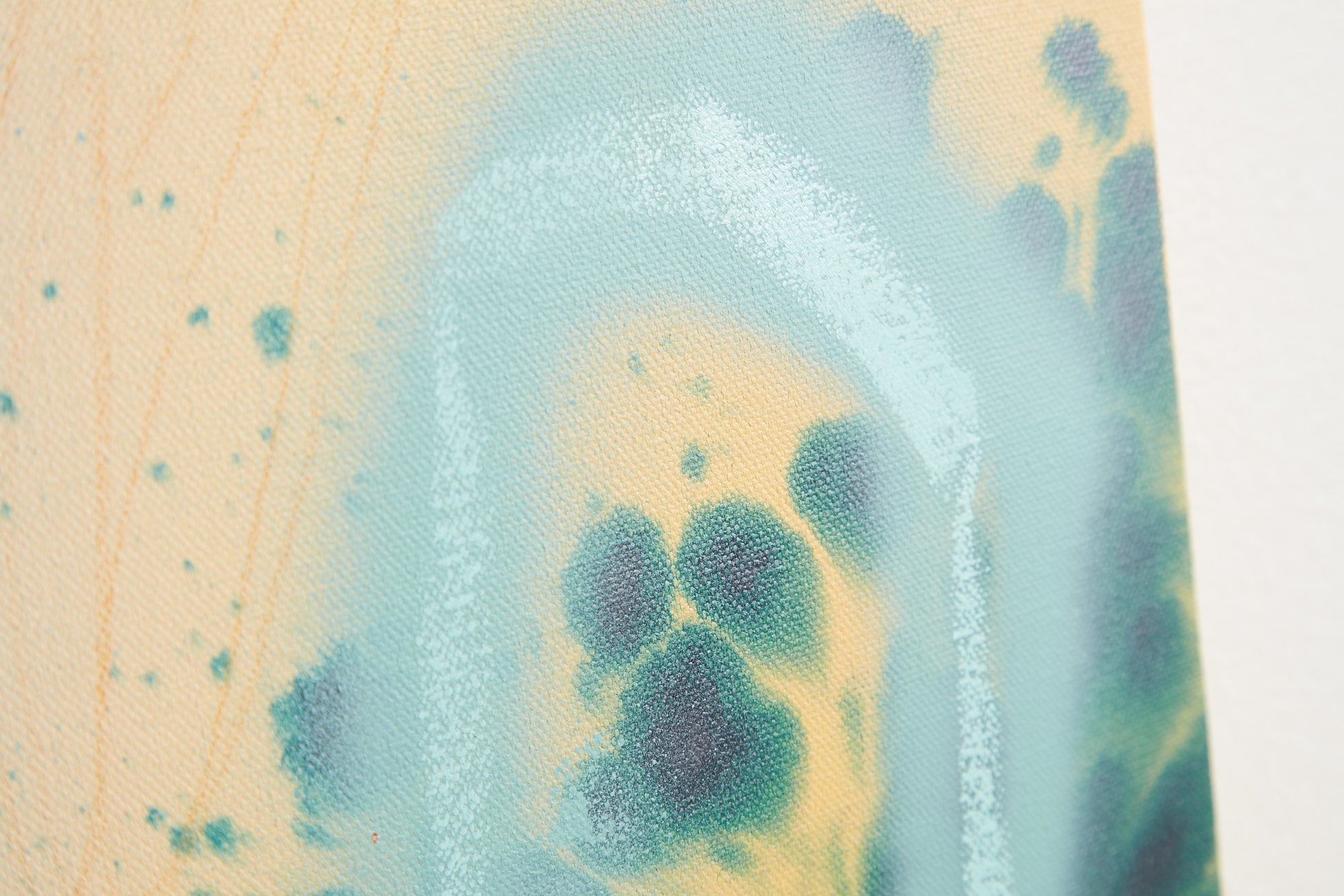 Paintings are constructed in layers - moving back and forth between the studio floor and an easel - to create all the drips, splashes, texture and detail.