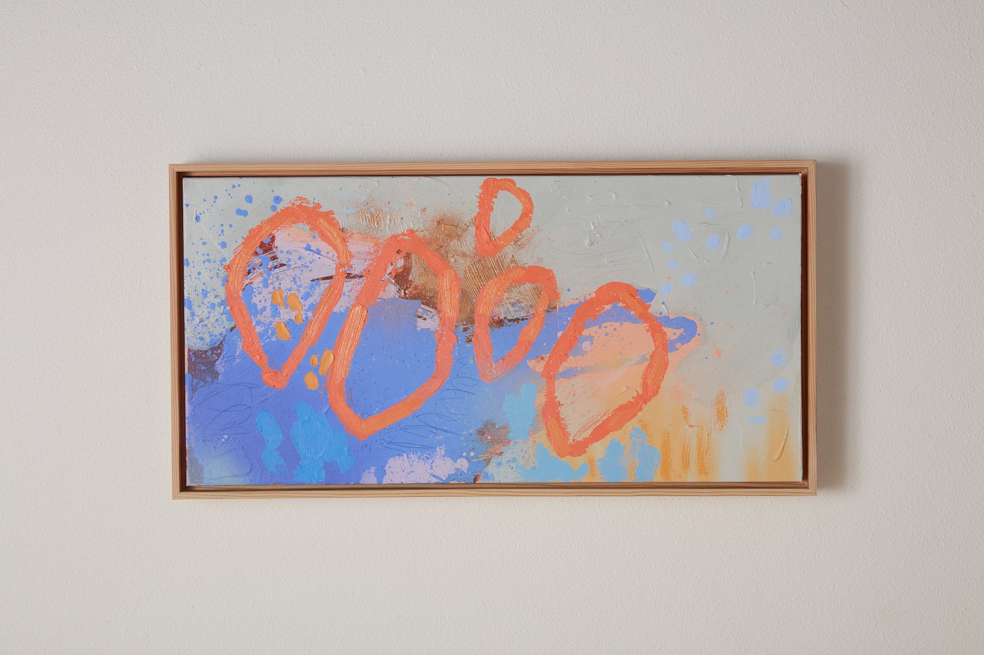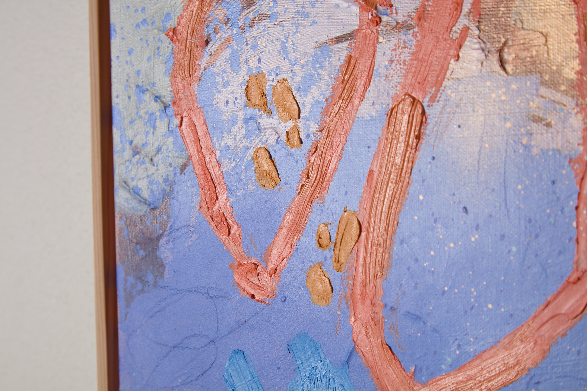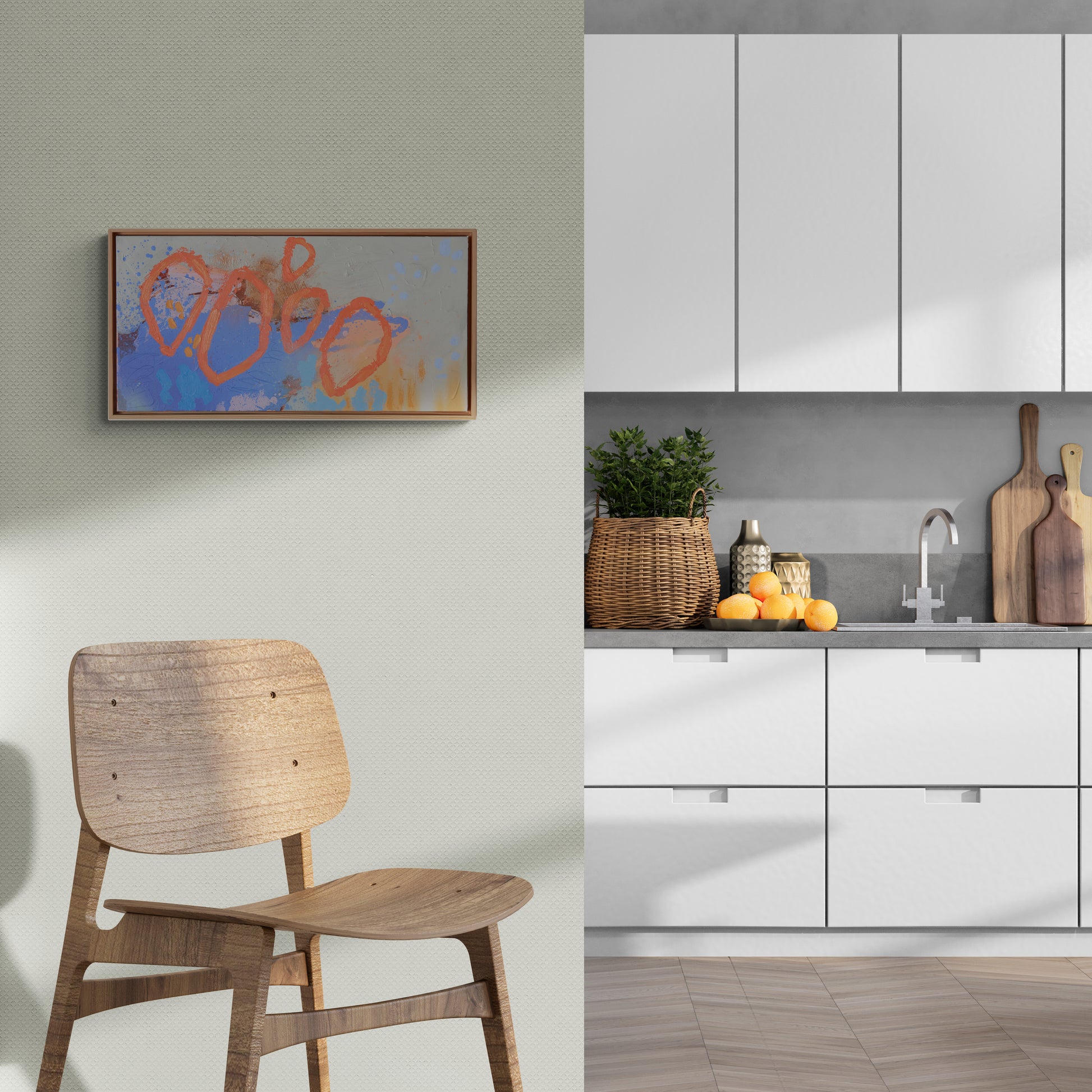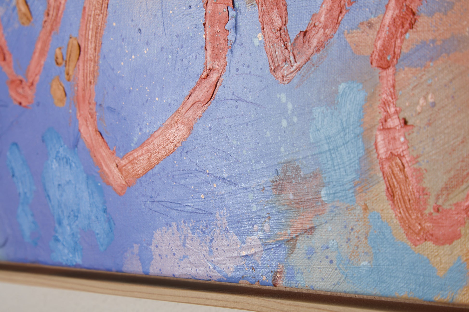 Original mixed media painting on stretched canvas, framed in solid Douglas Fir. Media includes acrylic, oil, spray paint, colored pencil. Ships framed and ready to hang.