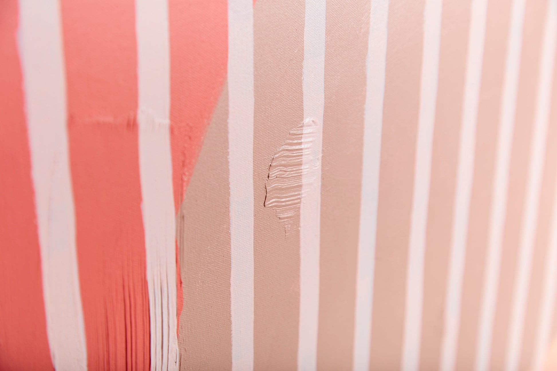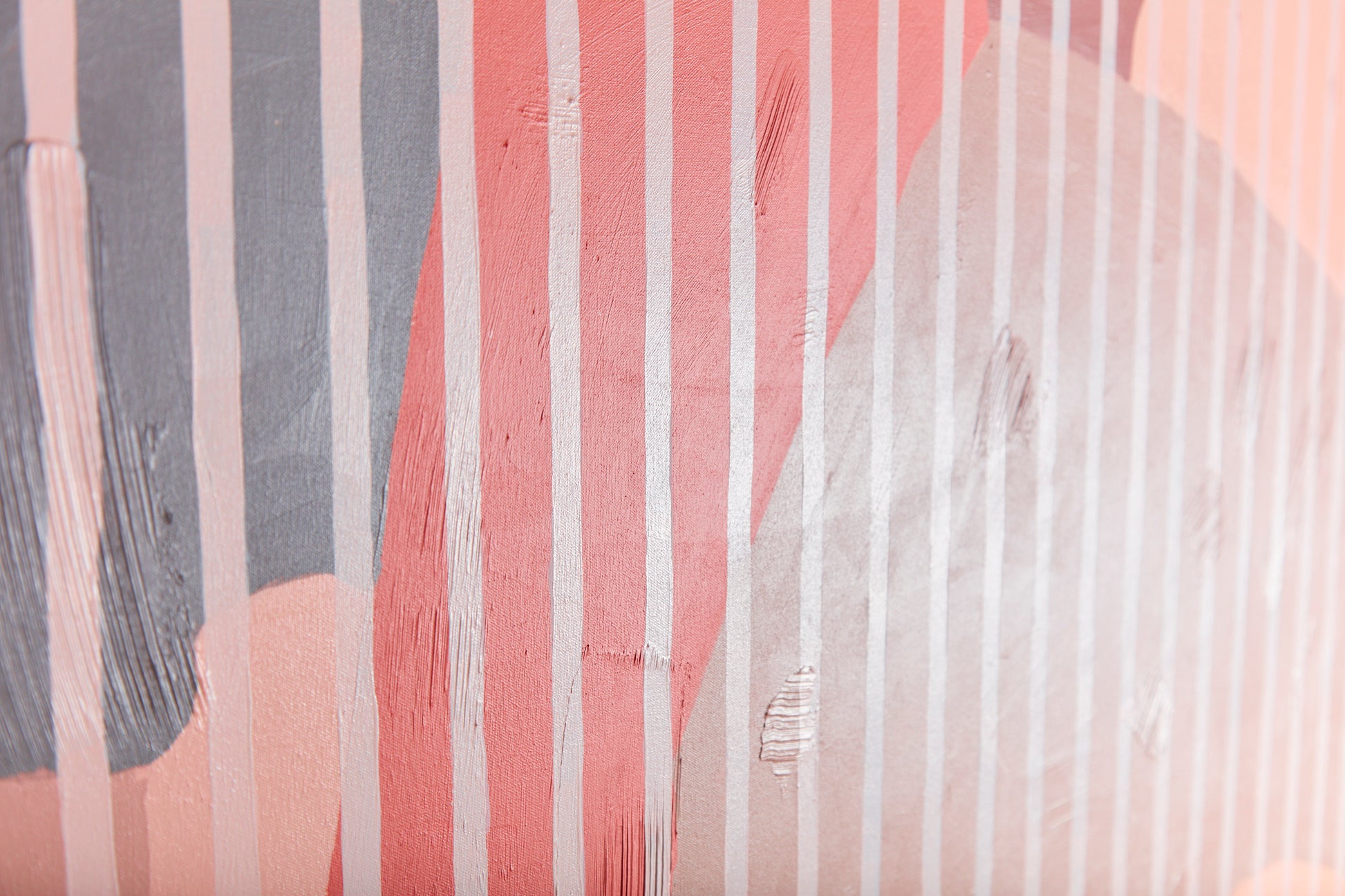 This piece is part of my March 2023 collection, and a brand new body of work defined by a lively colorblock foundation, partially obscured by organic pinstriping.