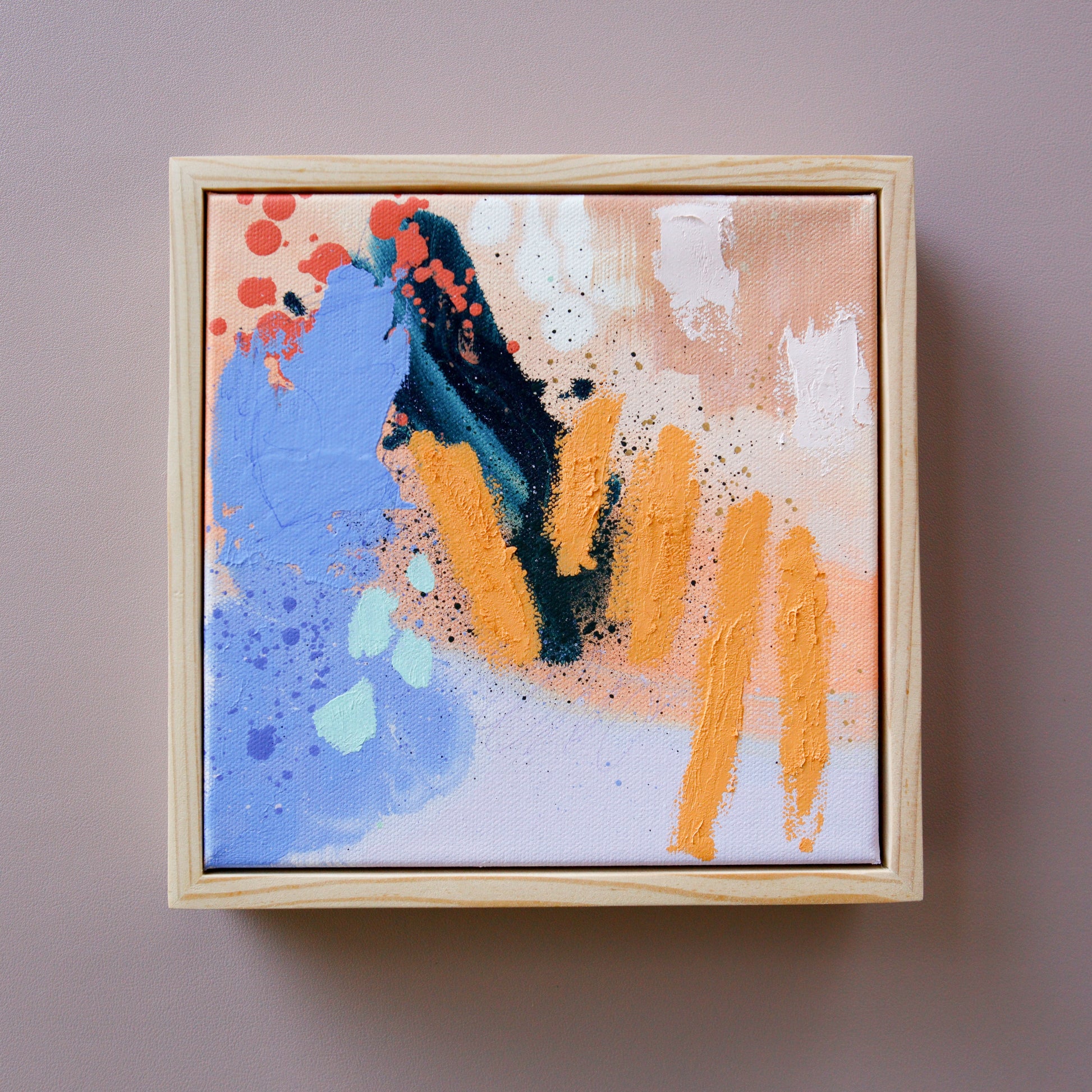 Original Mixed Media painting on stretched canvas. Acrylic, spray paint, ink and oil stick. Hand-built Douglas Fir strip frame. Framed size: 9x9x2 inches (23x23x5 cm).