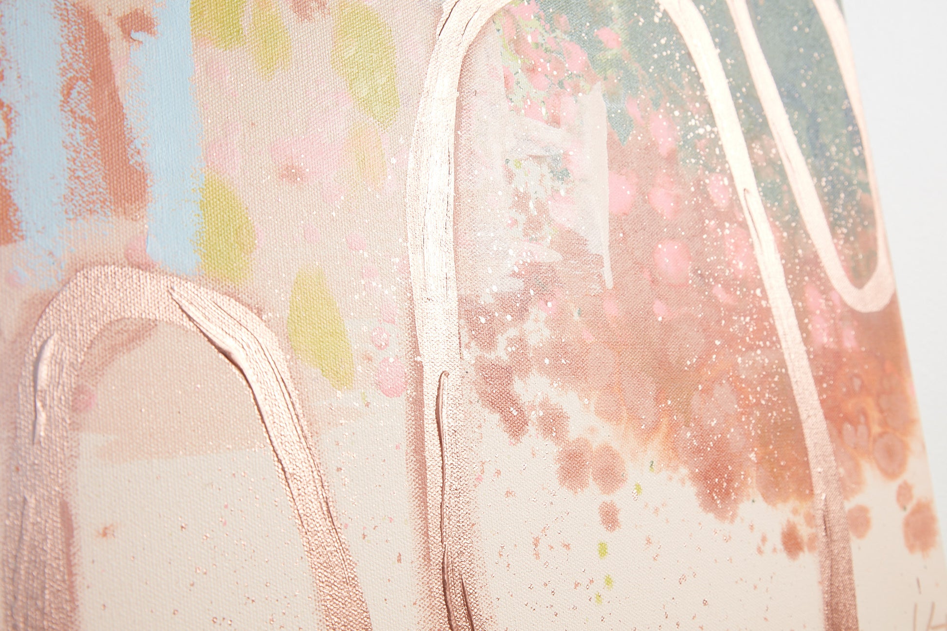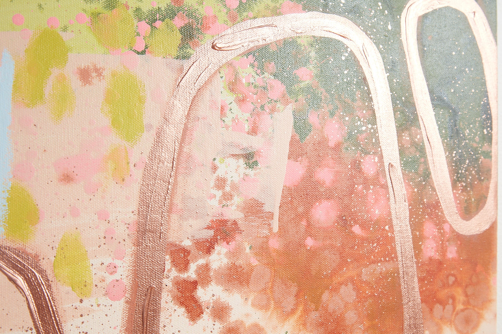 Paintings are constructed in layers - moving back and forth between the studio floor and an easel - to create all the drips, splashes, texture and detail.