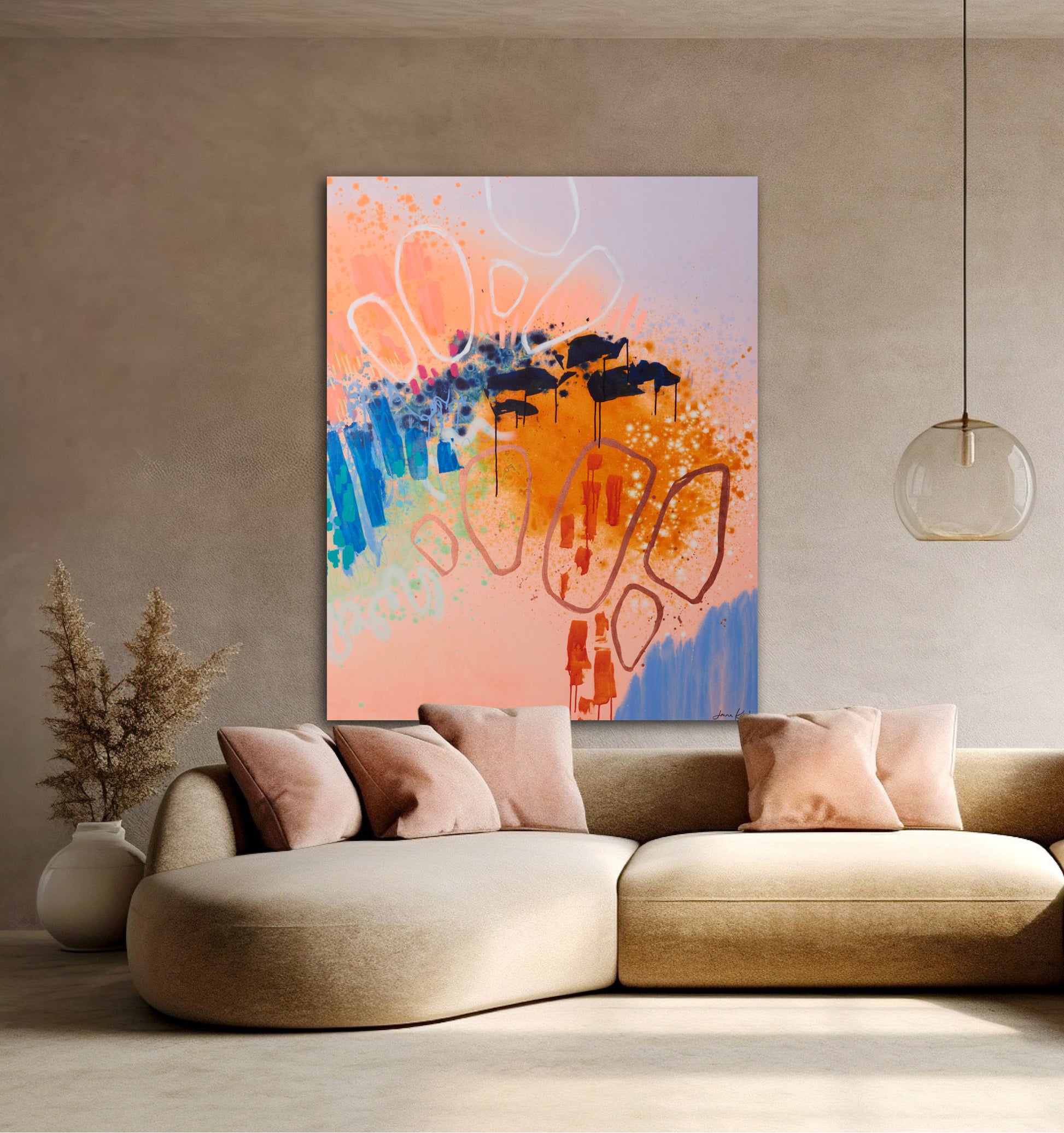 As your eyes roam the canvas, you'll be drawn to the vibrant interplay of hues. The warm embrace of yellows and oranges intertwines with the refreshing coolness of blues and greens, creating a harmonious balance that soothes the soul. Delicate strokes of sienna and violet add accents of intrigue, hinting at the hidden depths within the painting's narrative.