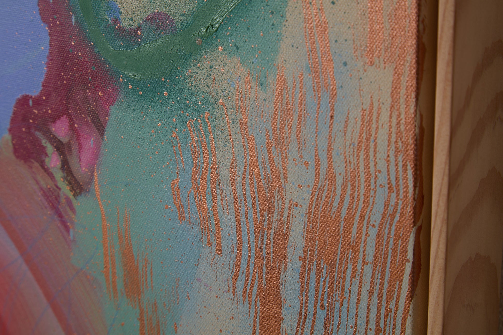 This piece is part of my Autumn Color Collection. The paintings in this collection are influenced by the changing light, changing color, and changing feeling that comes with the start of Fall. You’ll notice a shift toward more neutral and muted tones in many of the pieces, yet the signature vibrancy and bold nature remains intact. Paintings are constructed in layers - moving back and forth between the studio floor and an easel - to create all the drips, splashes, texture and detail.
