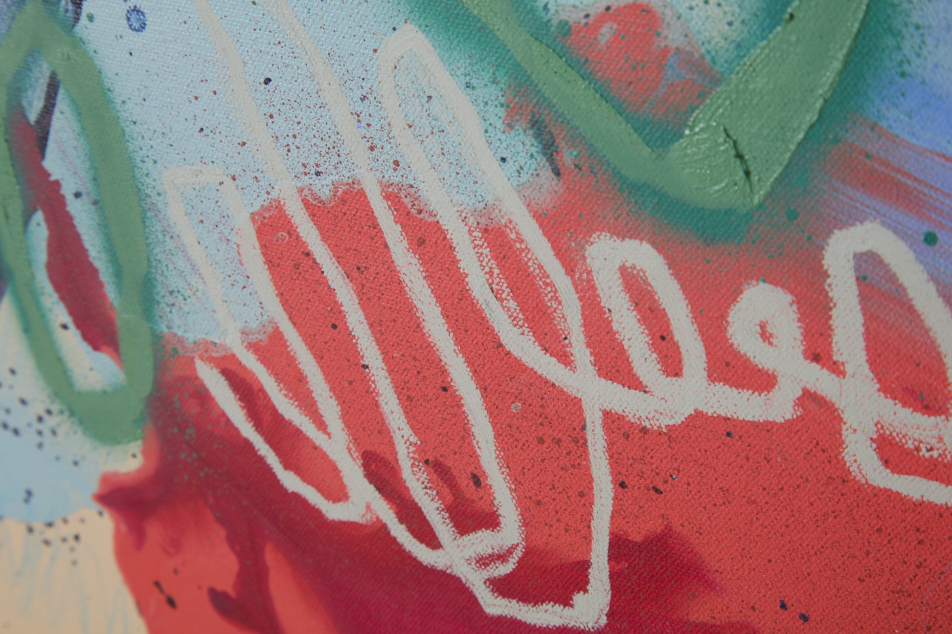 Original mixed media painting on stretched canvas, framed in solid Douglas Fir. Media includes acrylic, oil, spray paint, colored pencil. Ships framed and ready to hang.