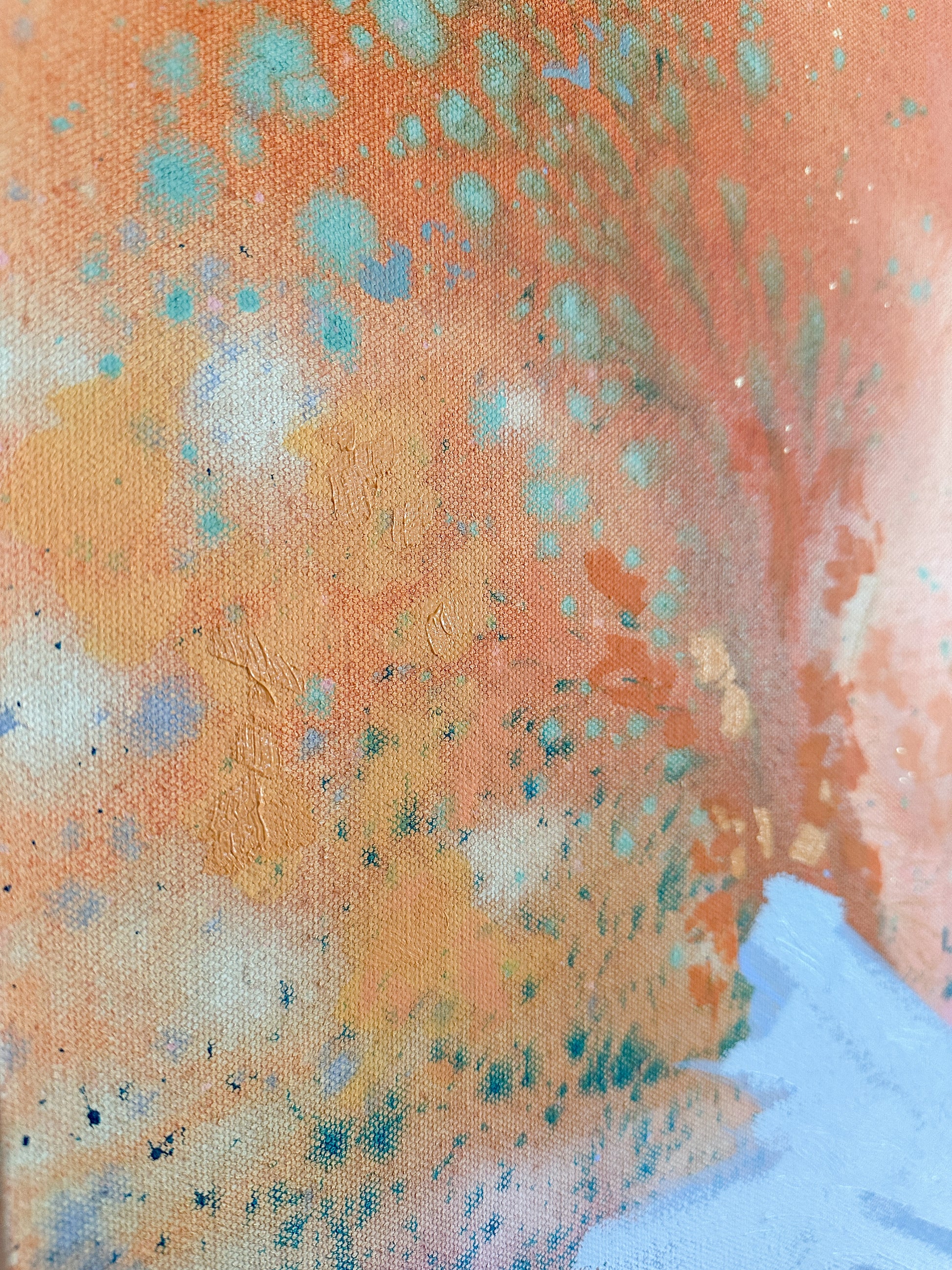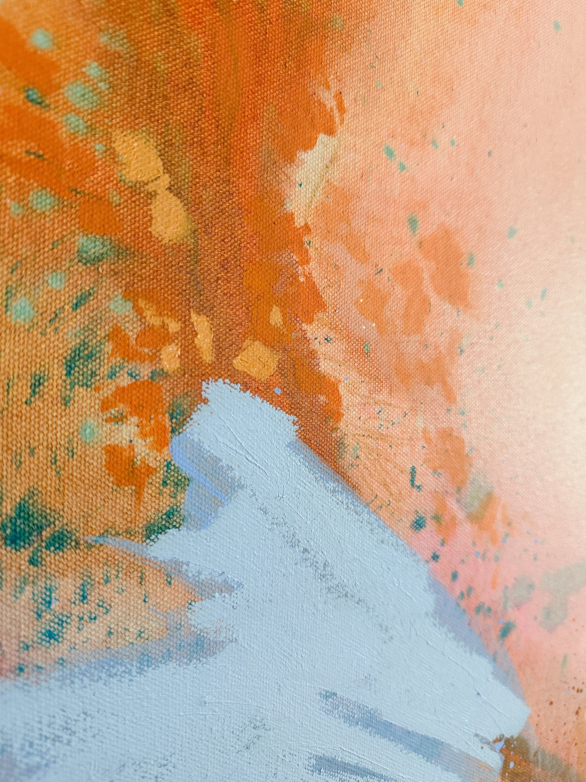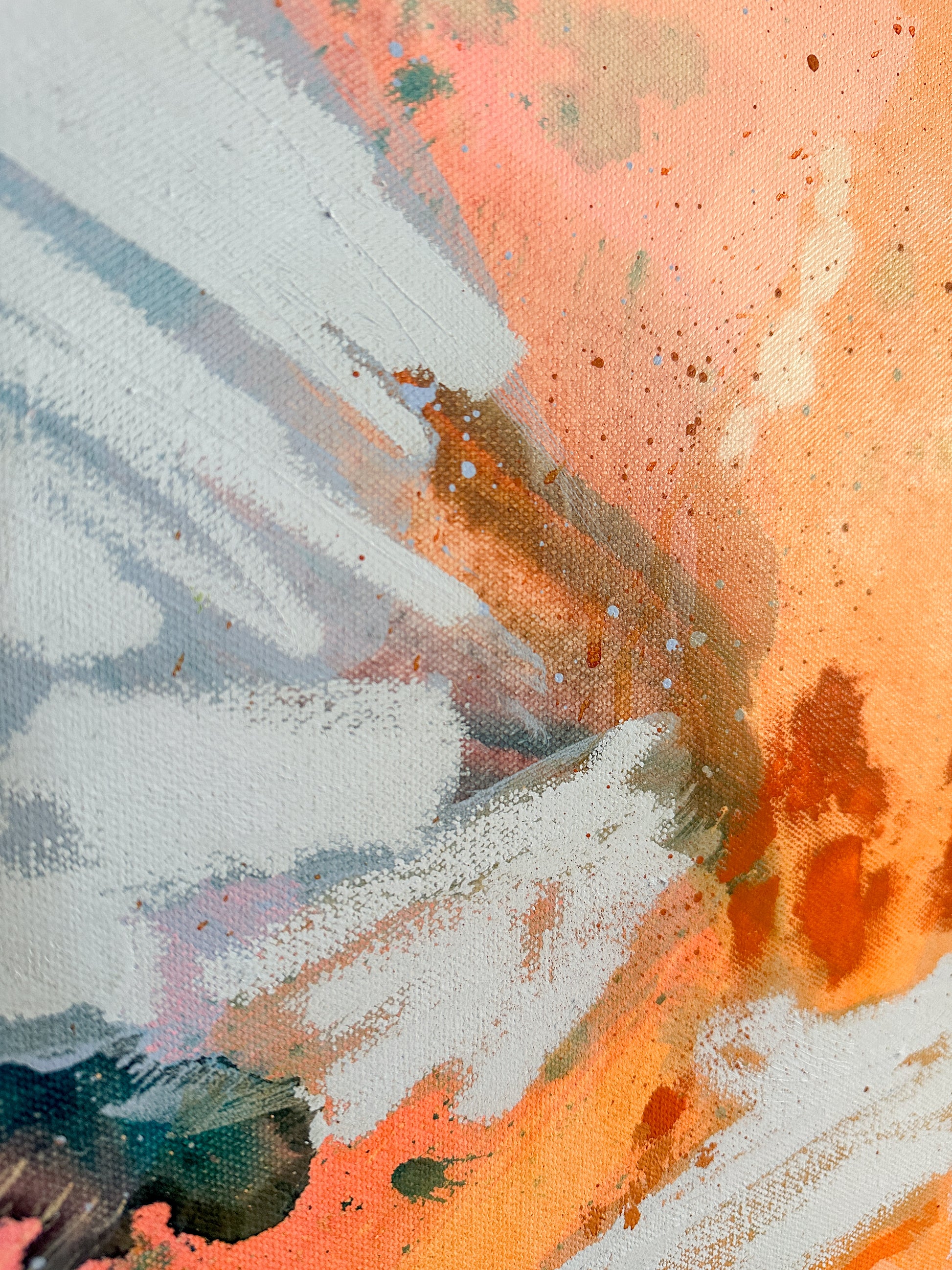 In this piece in particular is bold in its warmth, with your eye drawn to anchoring cool tones and dappled deep blues. The longer you look, the more you'll see subtle marks and colors that provide depth and interest in the most natural way.