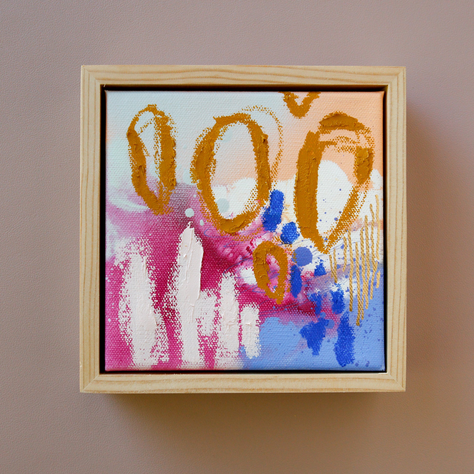 Original Mixed Media painting on stretched canvas. Acrylic, spray paint, ink and oil stick. Hand-built Douglas Fir strip frame. Framed size: 7x7x2 inches (18x18x5 cm).