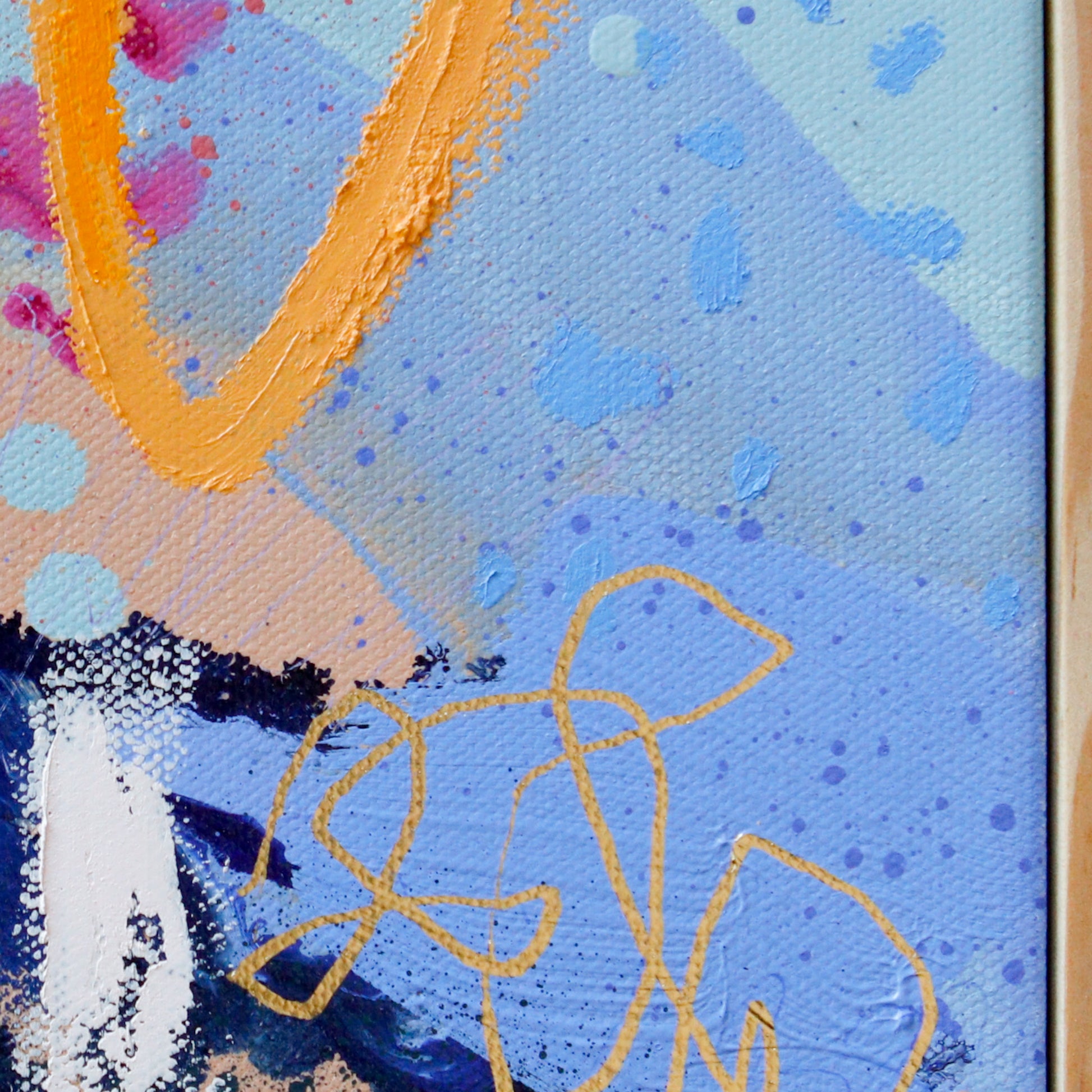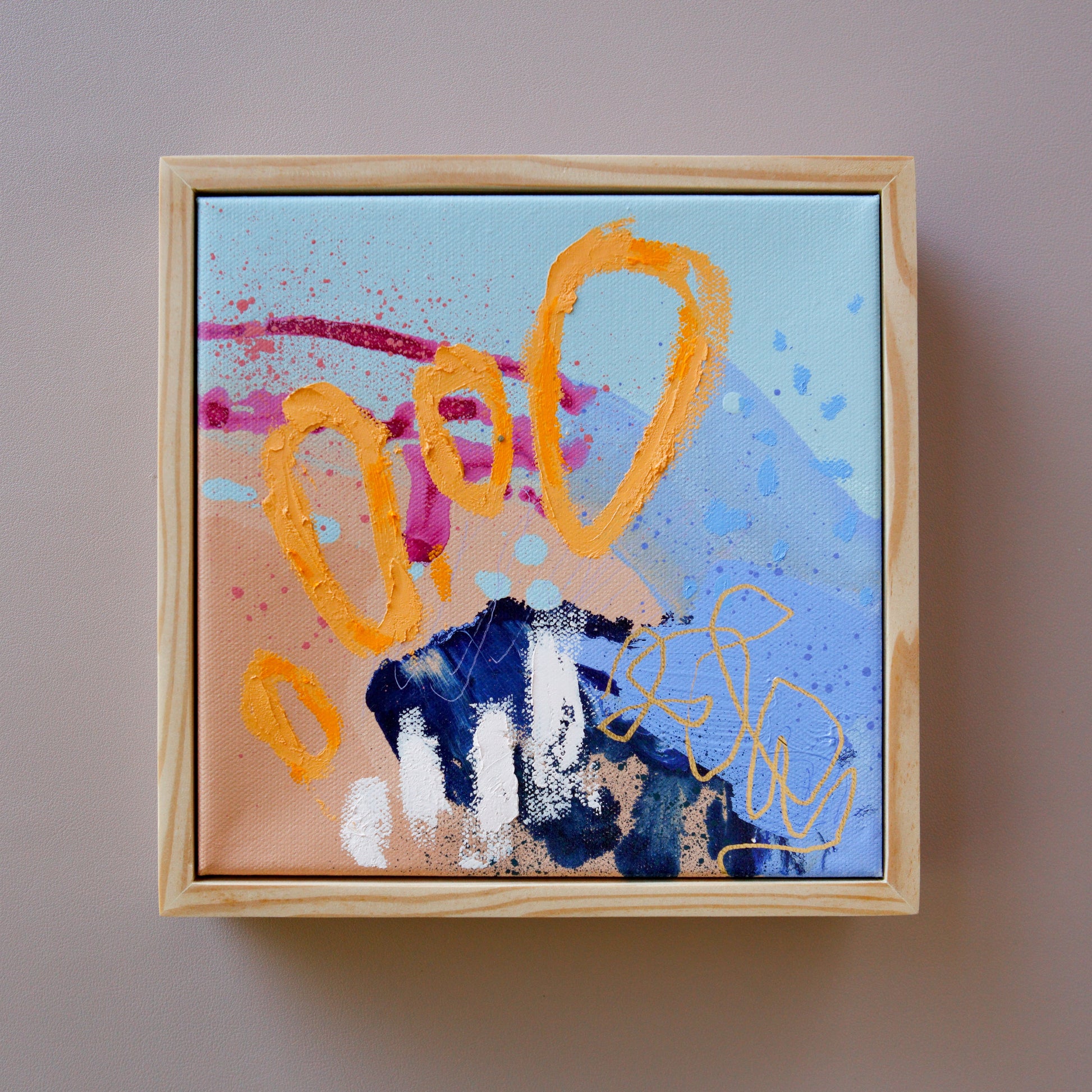 Original Mixed Media painting on stretched canvas. Acrylic, spray paint, ink and oil stick. Hand-built Douglas Fir strip frame. Framed size: 9x9x2 inches (23x23x5 cm).