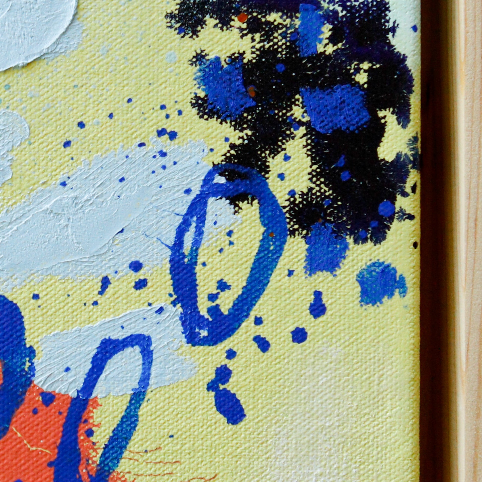 Original Mixed Media painting on stretched canvas. Acrylic, spray paint, ink and oil stick. Hand-built Douglas Fir float frame. Framed size: 7x7x2.5 inches (18x18x6 cm).